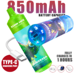 The device features a Type-C charging port at the bottom. A full charge takes about 40 minutes. Although disposable, it can be recharged multiple times. Thus, you can enjoy the full flavor of your chosen taste until the very end.