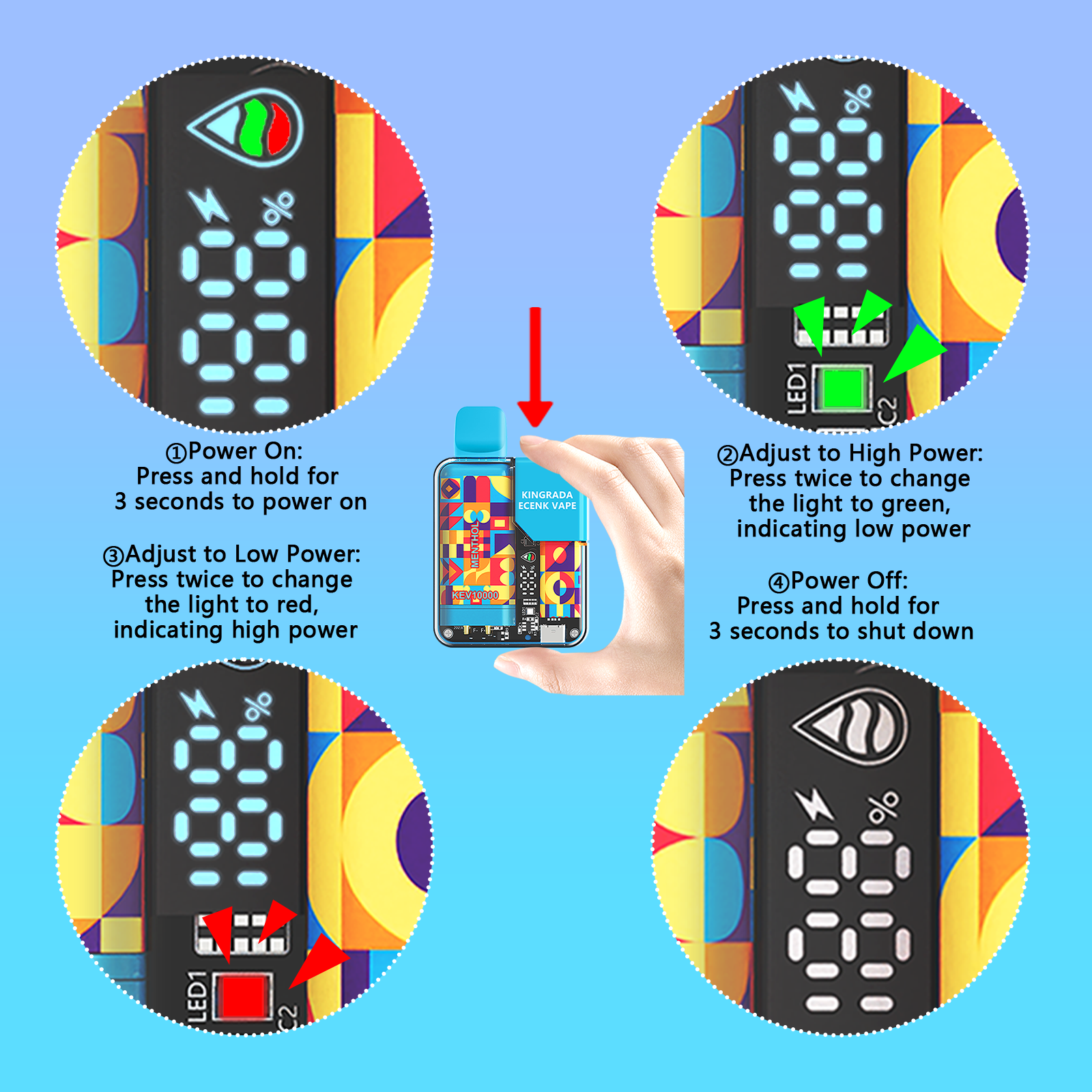 This <strong>disposable e-cigarette</strong> has an adjustable power button, allowing you to customize your vaping experience. Long press for 3 seconds to turn it on. Then, press twice to select high output mode (16W, red light). Press twice again for low output mode (11W, green light). As a result, you can easily adjust the smoke volume to your preference. Hold for 3 seconds to power off, ensuring child safety.