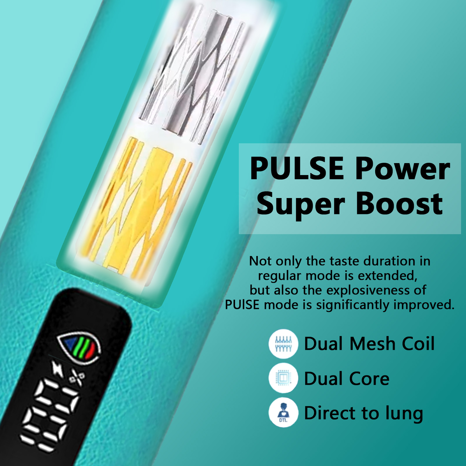 The suction works directly on the lungs to mimic realistic smoking conditions. In addition, the double mesh coil technology extends the life of the flavor in normal mode and greatly enhances the explosive vapor experience, delivering more satisfying puffs.