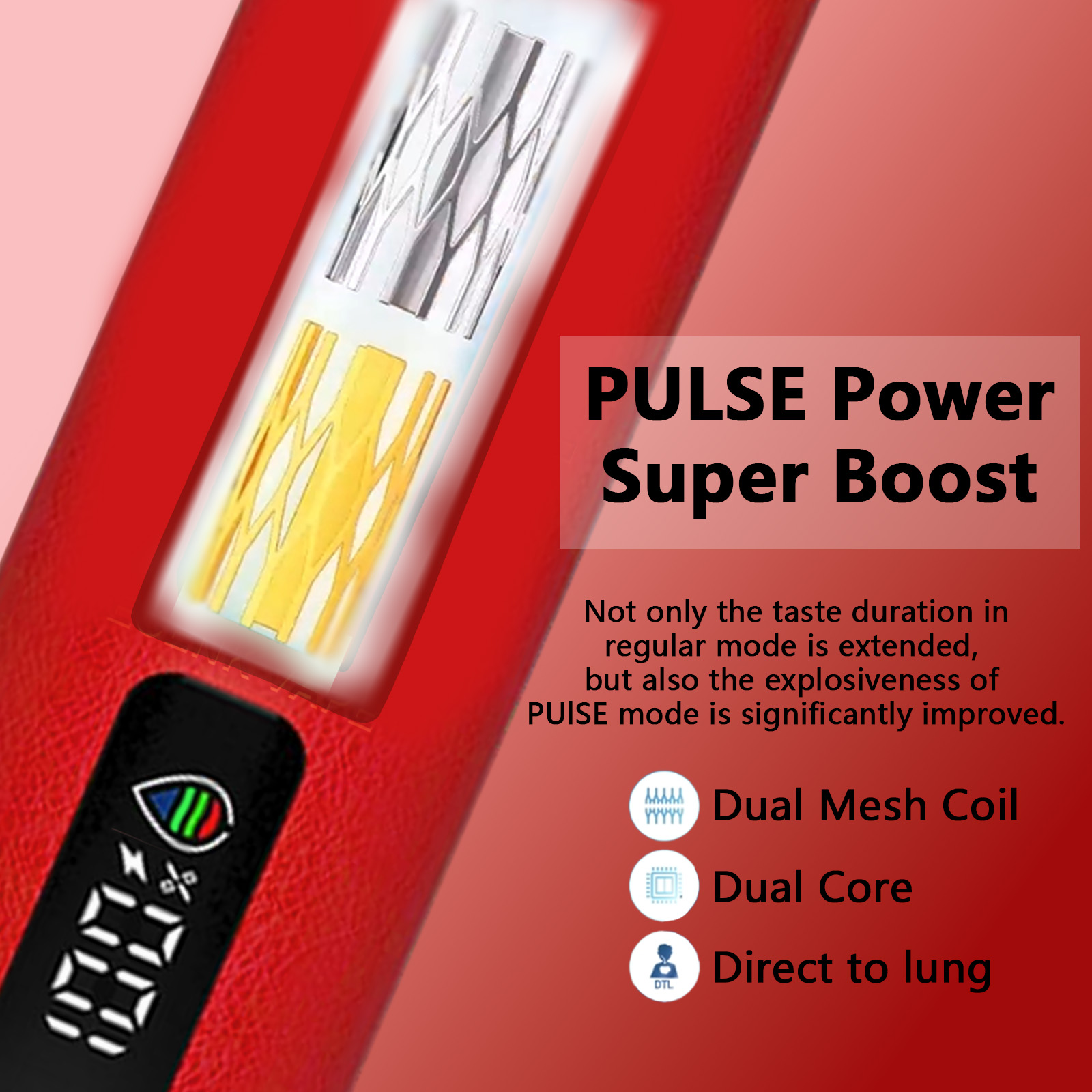 The suction works directly on the lungs to mimic realistic smoking conditions. In addition, the double mesh coil technology extends the life of the flavor in normal mode and greatly enhances the explosive vapor experience, delivering more satisfying puffs.