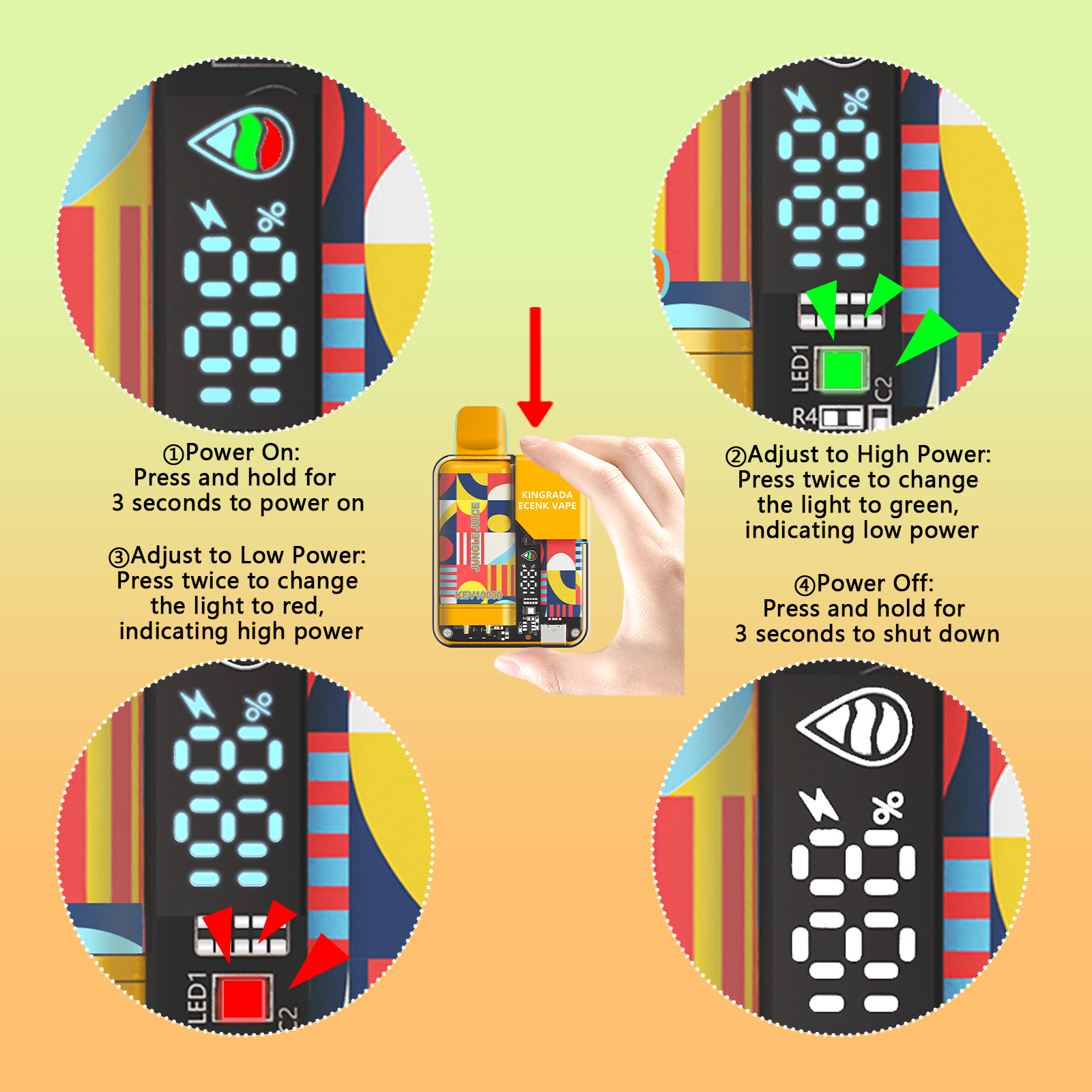 This <strong>disposable e-cigarette</strong> has an adjustable power button, allowing you to customize your vaping experience. Long press for 3 seconds to turn it on. Then, press twice to select high output mode (16W, red light). Press twice again for low output mode (11W, green light). As a result, you can easily adjust the smoke volume to your preference. Hold for 3 seconds to power off, ensuring child safety.