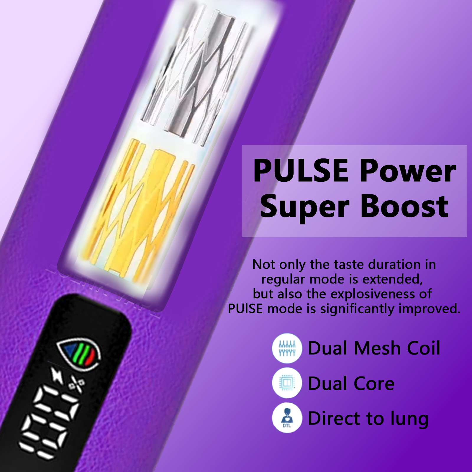 The suction works directly on the lungs to mimic realistic smoking conditions. In addition, the double mesh coil technology extends the life of the flavor in normal mode and greatly enhances the explosive vapor experience, delivering more satisfying puffs.