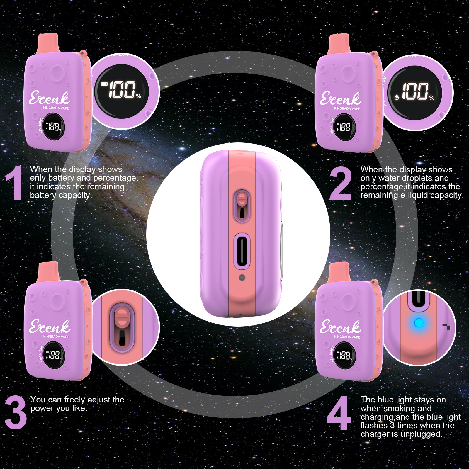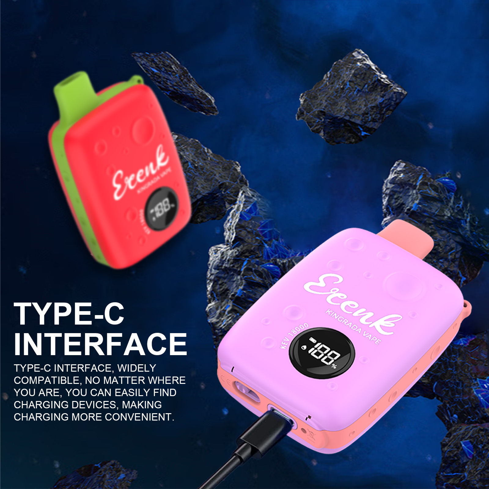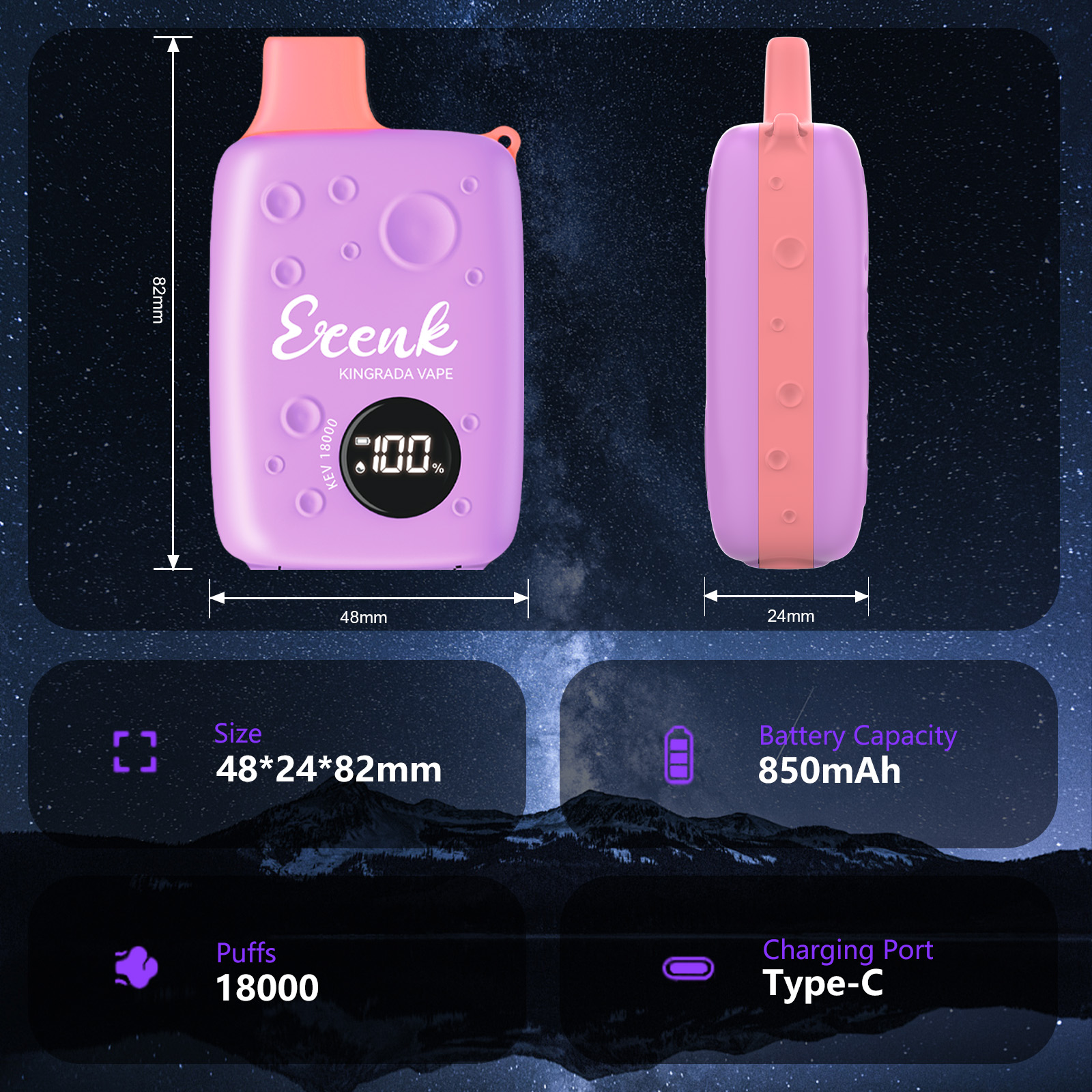 The bottom of the device features a Type-C charging port for fast charging. Therefore, you can enjoy fresh and rich flavor every time.