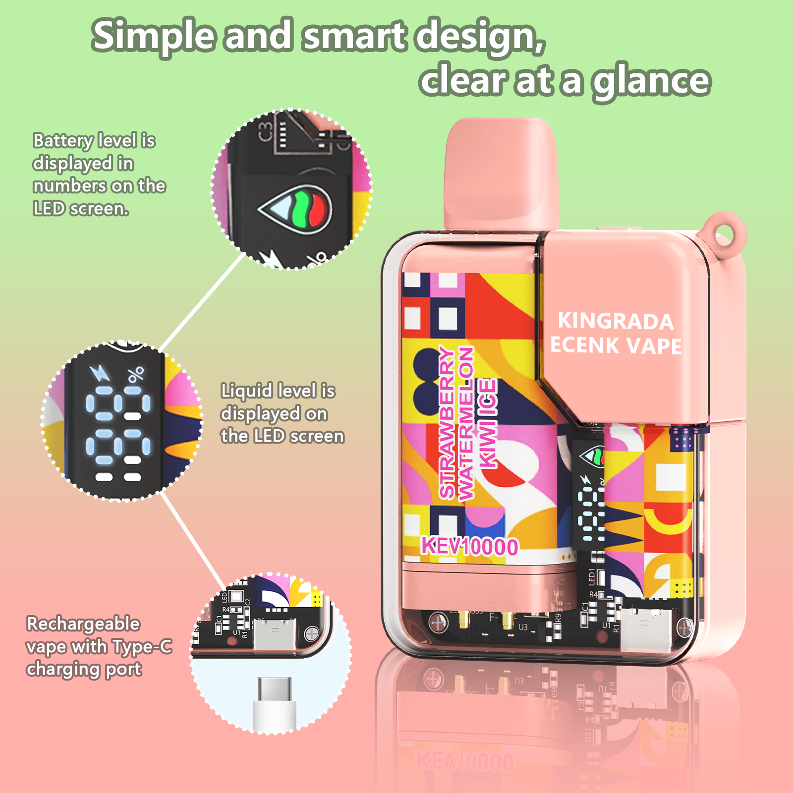The Type-C charging port allows fast and efficient charging. The LED light flashes while charging and turns off when fully charged. Thus, you will never be left waiting. This feature makes vaping more convenient and reliable.