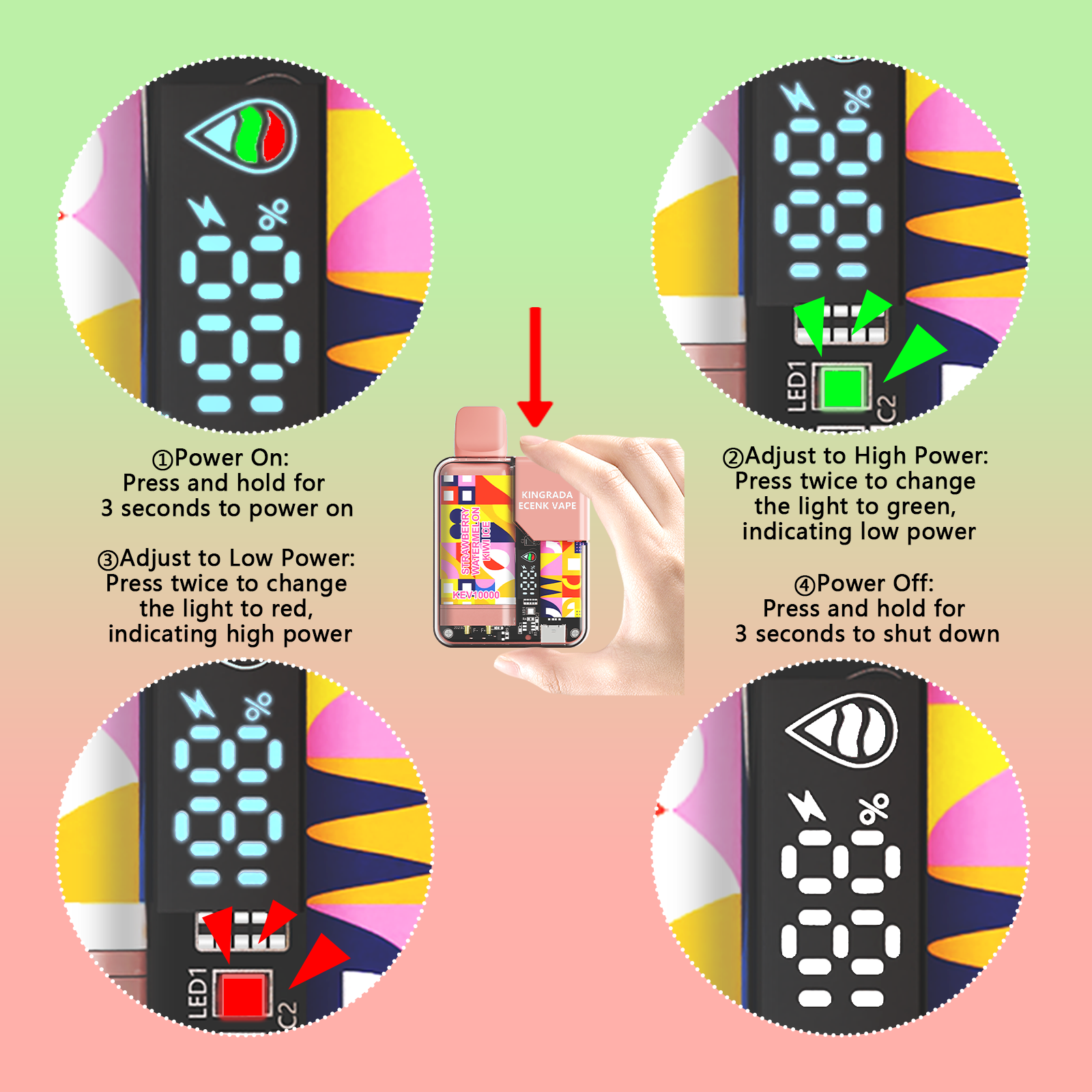 This <strong>disposable e-cigarette</strong> has an adjustable power button, allowing you to customize your vaping experience. Long press for 3 seconds to turn it on. Then, press twice to select high output mode (16W, red light). Press twice again for low output mode (11W, green light). As a result, you can easily adjust the smoke volume to your preference. Hold for 3 seconds to power off, ensuring child safety.
